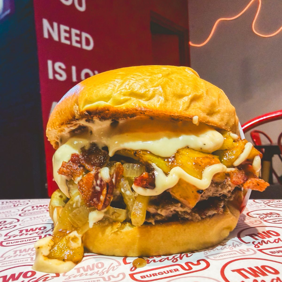 Torta Smash, queso suizo, bacon, cebolla caramelizada, cebolla crispy, pepinillos, mayo trufada y acompañamiento