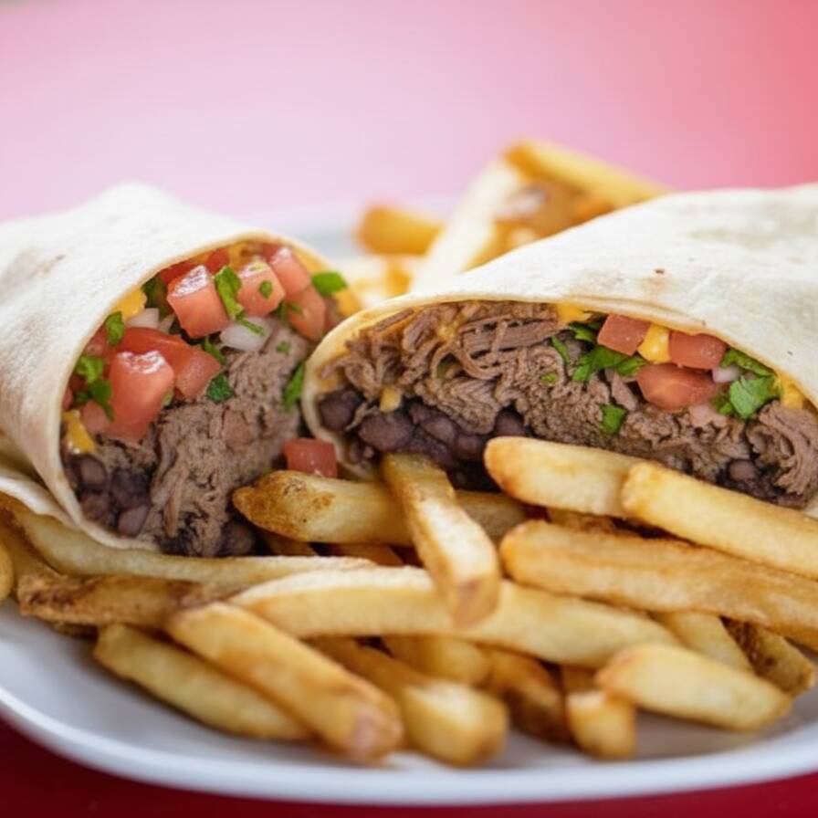 Burrito con tortilla de harina, carne mechada de res, frijoles molidos, pico de gallo.