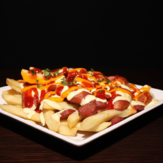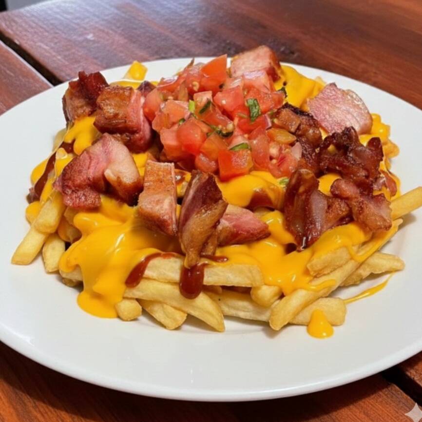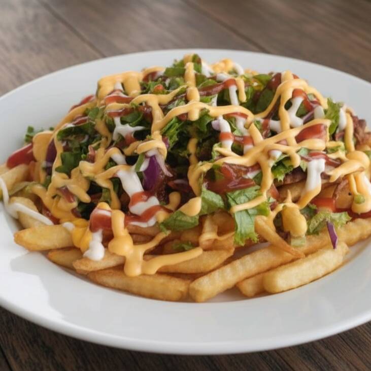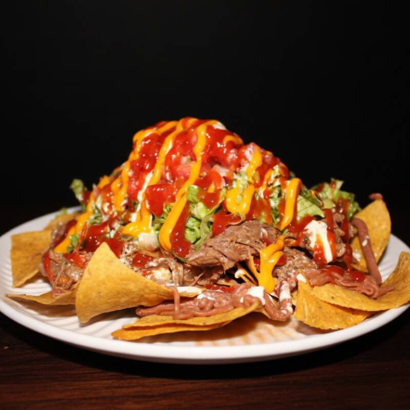 Papas fritas con carne mechada, pico de gallo y frijoles molidos.