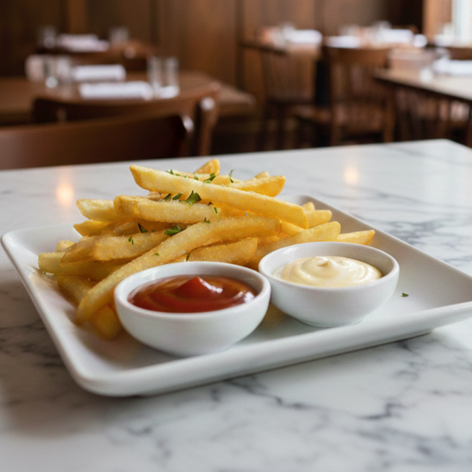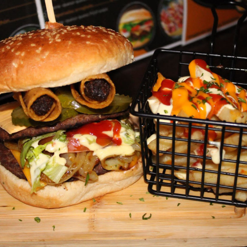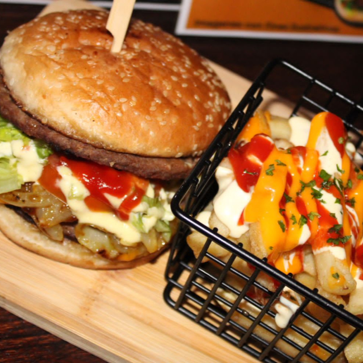 Hamburguesa con doble torta de carne de res, queso amarillo, lechuga, tomate, salsa de tomate y mayonesa, acompañado de papas fritas.