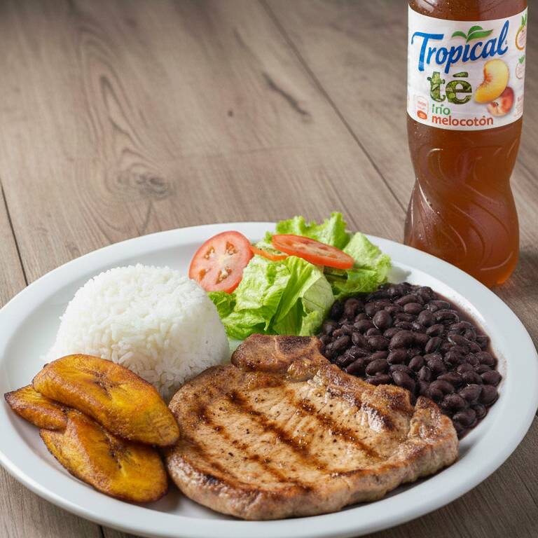 Casado con arroz blanco, frijoles, plátano maduro, huevo duro y ensalada verde (lechuga y tomate) más refresco de tropical 350 ml.