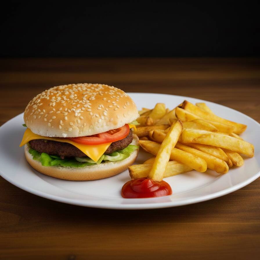 Hamburguesa con torta de carne de res, queso amarillo, lechuga, tomate, salsa de tomate y mayonesa, acompañado de papas fritas.