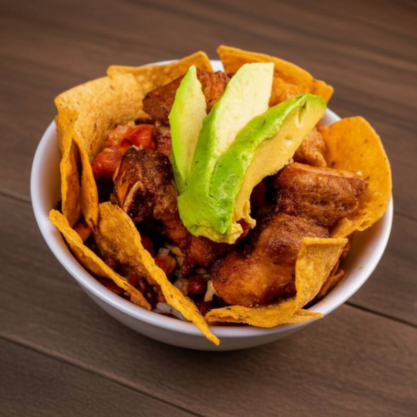 Chifrijo tradicional con chicharrón, arroz, frijoles tiernos, aguacate.