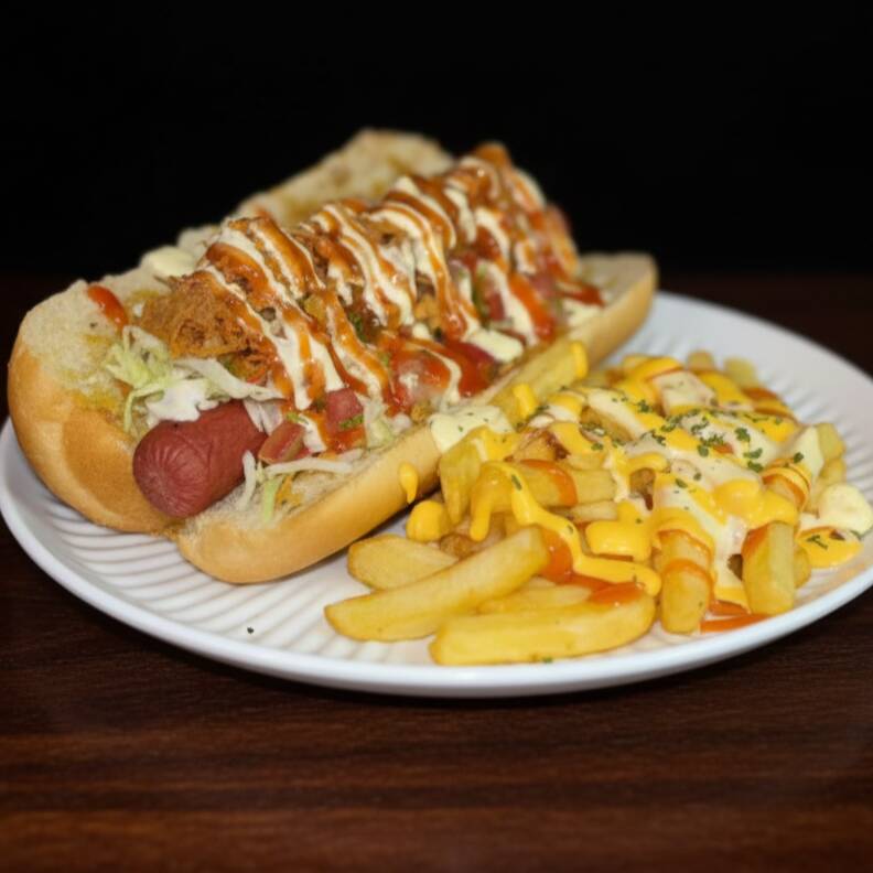 2 Hot dogs pequeños, con salchicha frita, repollo, salsa de tomate y mayonesa.