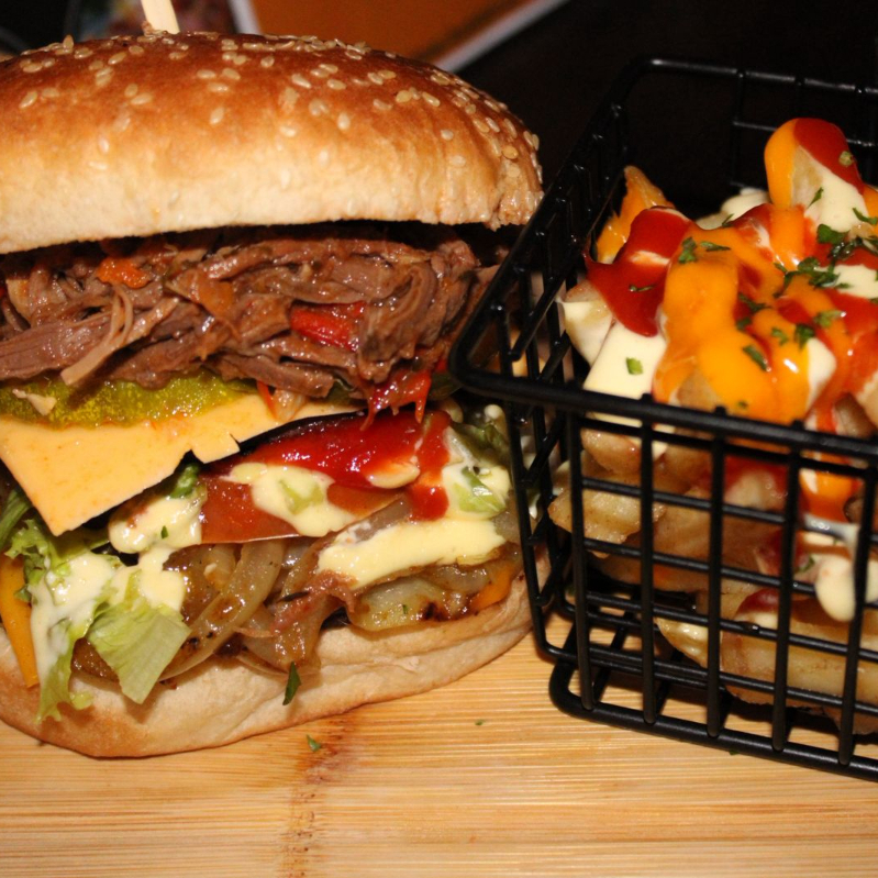 Hamburguesa con carne mechada de res, queso amarillo, lechuga, tomate, salsa de tomate y mayonesa, acompañado de papas fritas.