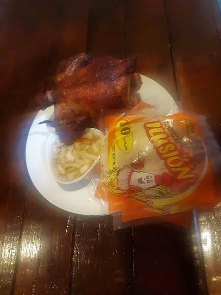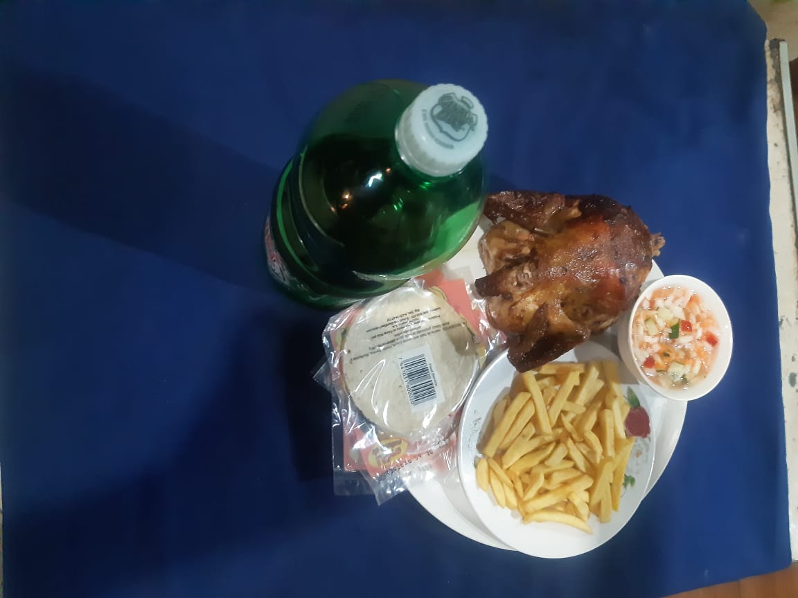 Un pollo asado entero, una orden de papas o patacones con frijoles, tortillas, escabeche y una gaseosa de 2 L.