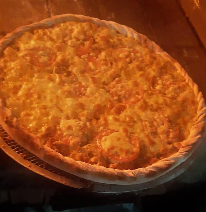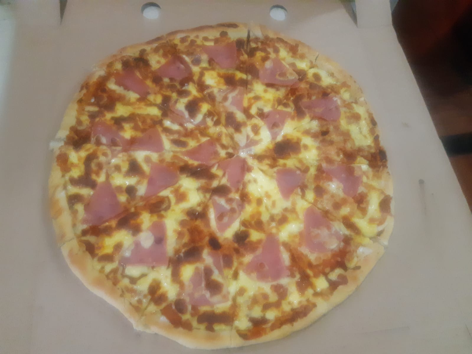 Una pizza grande de cualquier sabor y una pizza pequeña de jamón y queso.