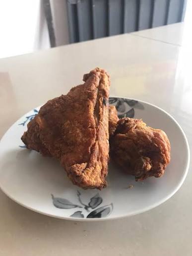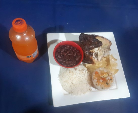 Arroz, frijoles, ensalada verde, doraditas, 1/4 de pollo y refresco de té frío.