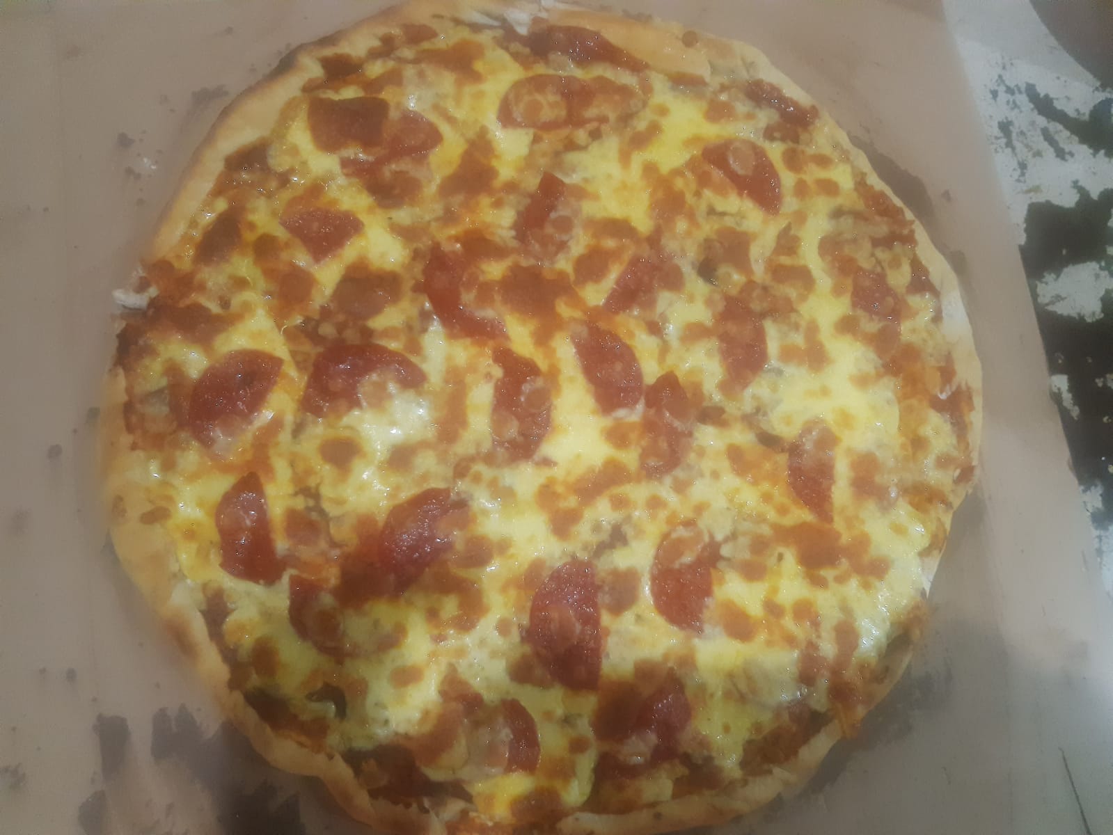 Salsa, queso, pepperoni, pollo mechado, chile dulce, cebolla y hongos.