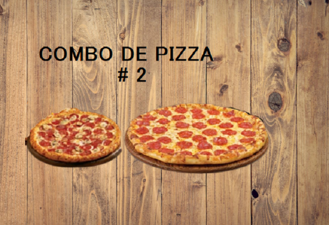 Una pizza grande de cualquier sabor y una pizza mediana de jamón y queso.