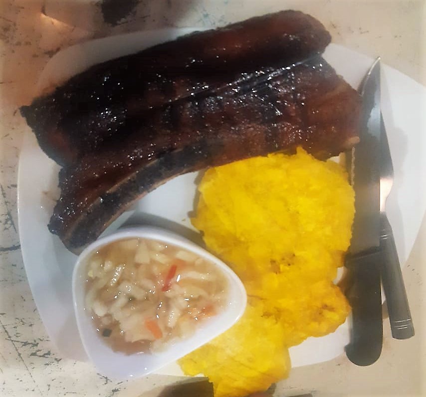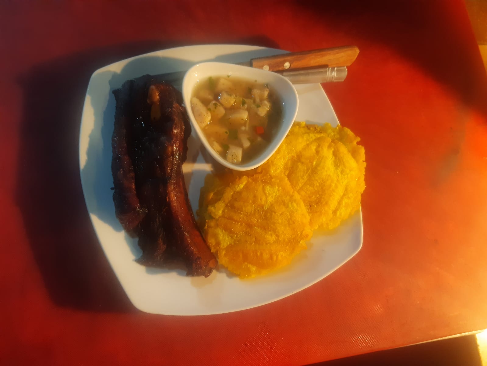 Una porción de costilla asada, una orden de papas o patacones y un refresco natural de té frío.