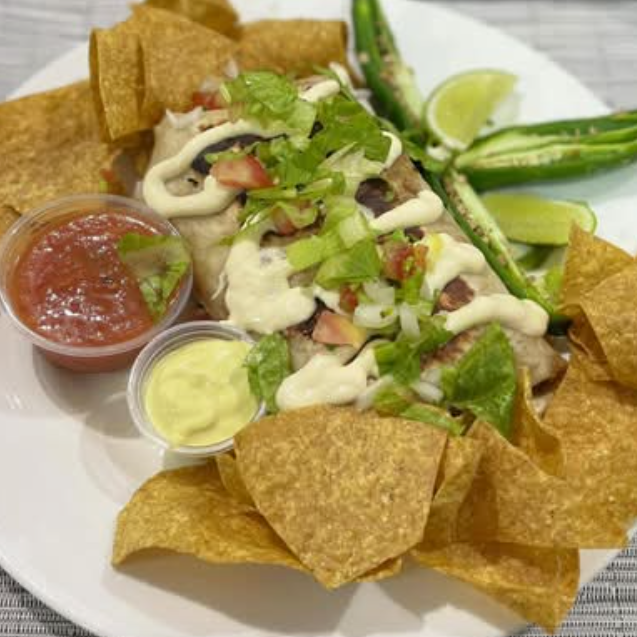 Corte fino de res, con arroz, frijoles charros, mozzarella, lechuga fresca, tomate y natilla, enrollado en tortilla de harina y sellado a la plancha. Acompañado de salsa a elección.