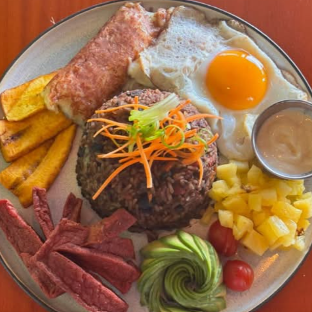 Gallo pinto, carne o pollo en salsa o salchichon, huevo, queso frito, platano maduro, aguacate, natilla y pan tostado. Fruta de temporada.