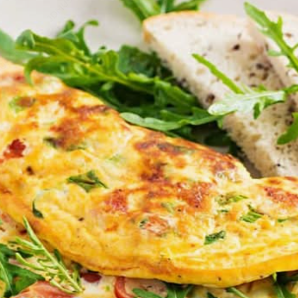 Huevo, queso mozarella, jamón, tomate, champiñon, cebolla, chile dulce, y cebollino, acompañado de natilla y tostadas.