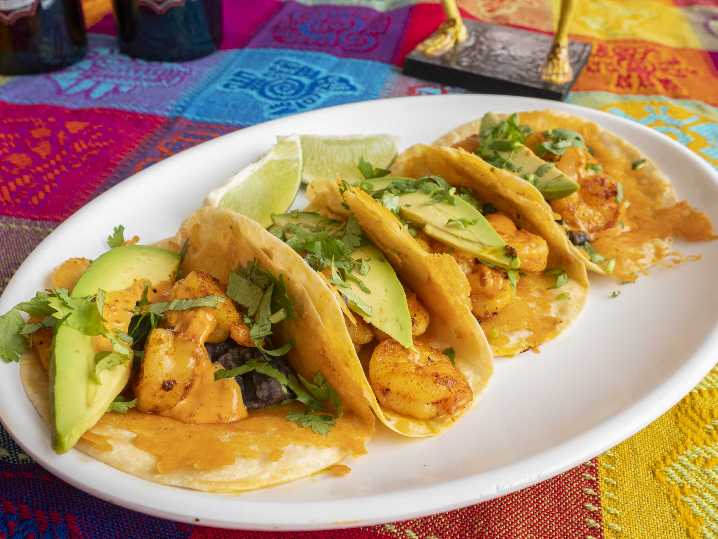 Al estilo Santokatrin. Tres tortillas de harina , queso mozzarella, cama de frijoles negros enteros, camarones salteados. Coronados con un toque de salsa chipotle y tiras de aguacate.