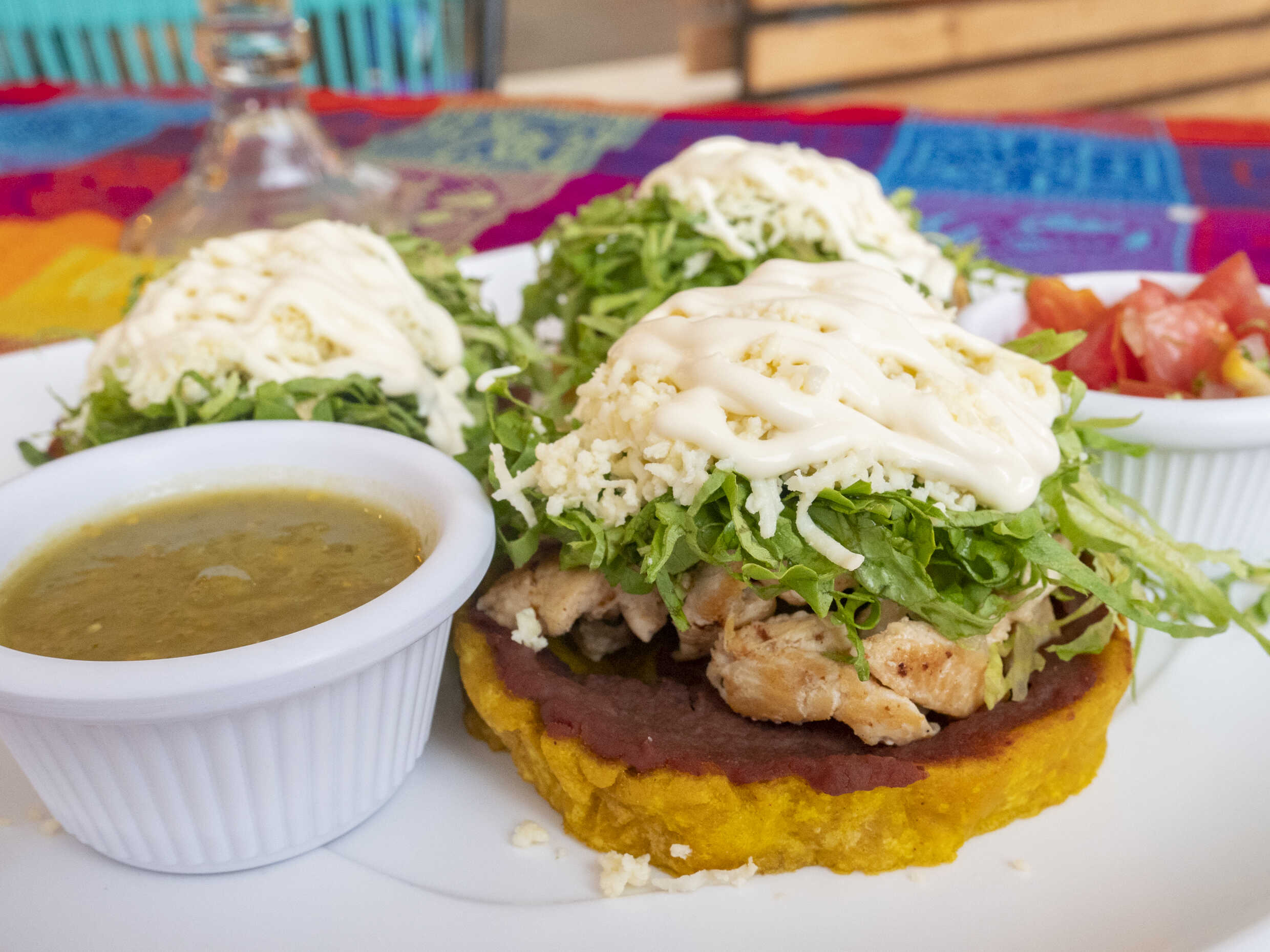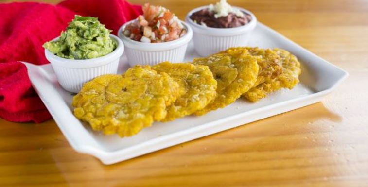 Patacones acompañados de frijolitos con queso, guacamole y pico de gallo.