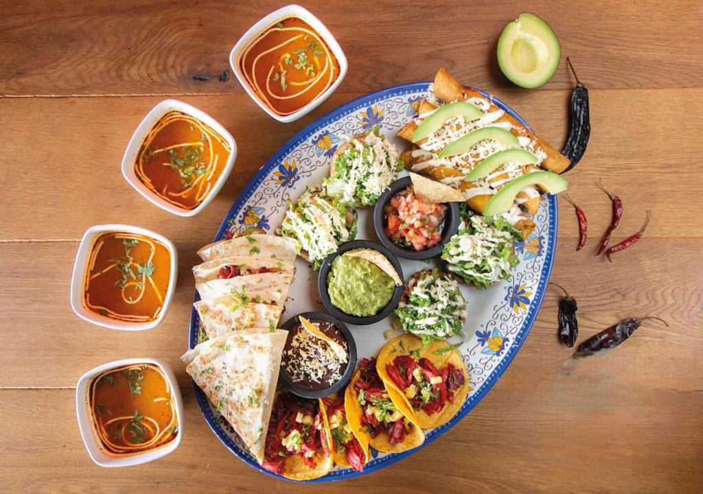 Una delicia, incluye: 4 sopitas de entrada, 4 de tacos al pastor, 4 gringuitas al pastor, 4 sopes de pollo mechado, 4 flautas de pollo mechado, guacamole, frijoles y pico de gallo.