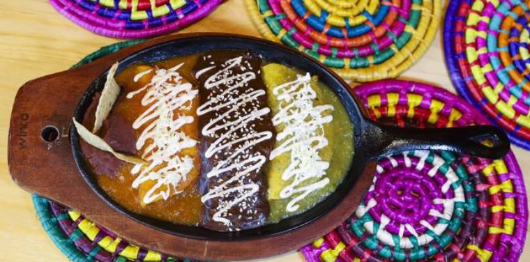Tres enchiladas rellenas de pollo mechado y bañadas con nuestra exquisita salsa verde, roja o divorciadas con natilla y queso gratinado.