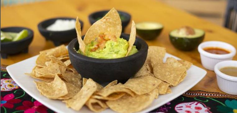 Guacamole de aguacate con chips de tortilla.