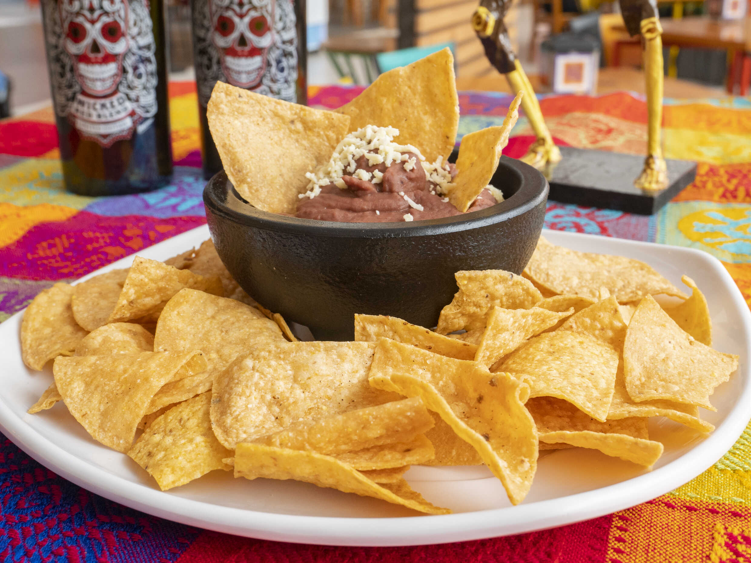 Frijolitos refritos, con queso encima y Totopos