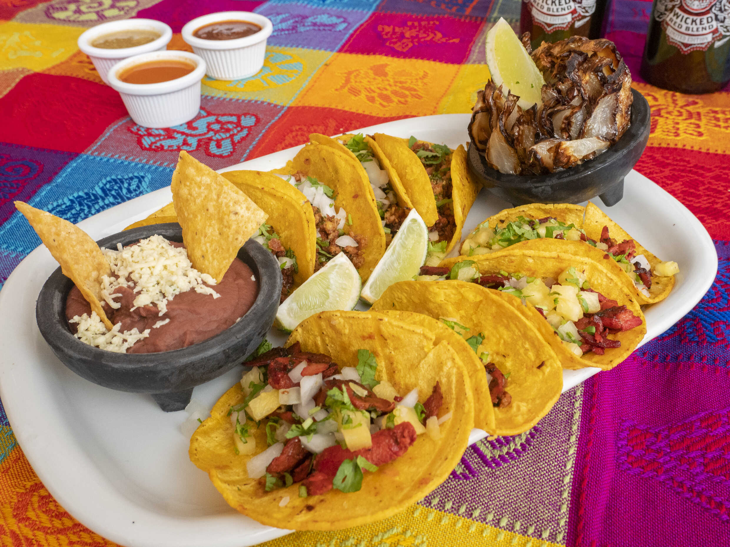 8 Deliciosos tacos al pastor o chorizo, 1 cebollita asada, 1 entradita de frijoles y 2 bebidas.