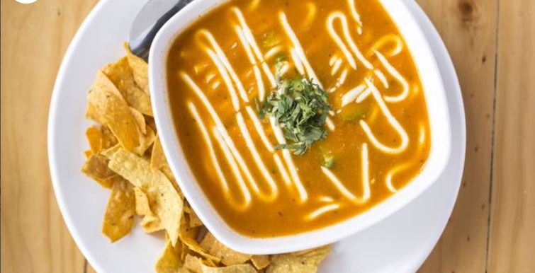 Lo más tradicional de las sopas, preparadas con caldo de pollo y tomate, acompañada de natilla, queso semiduro en daditos, aguacate y tiras crujientes de tortilla de maíz.
