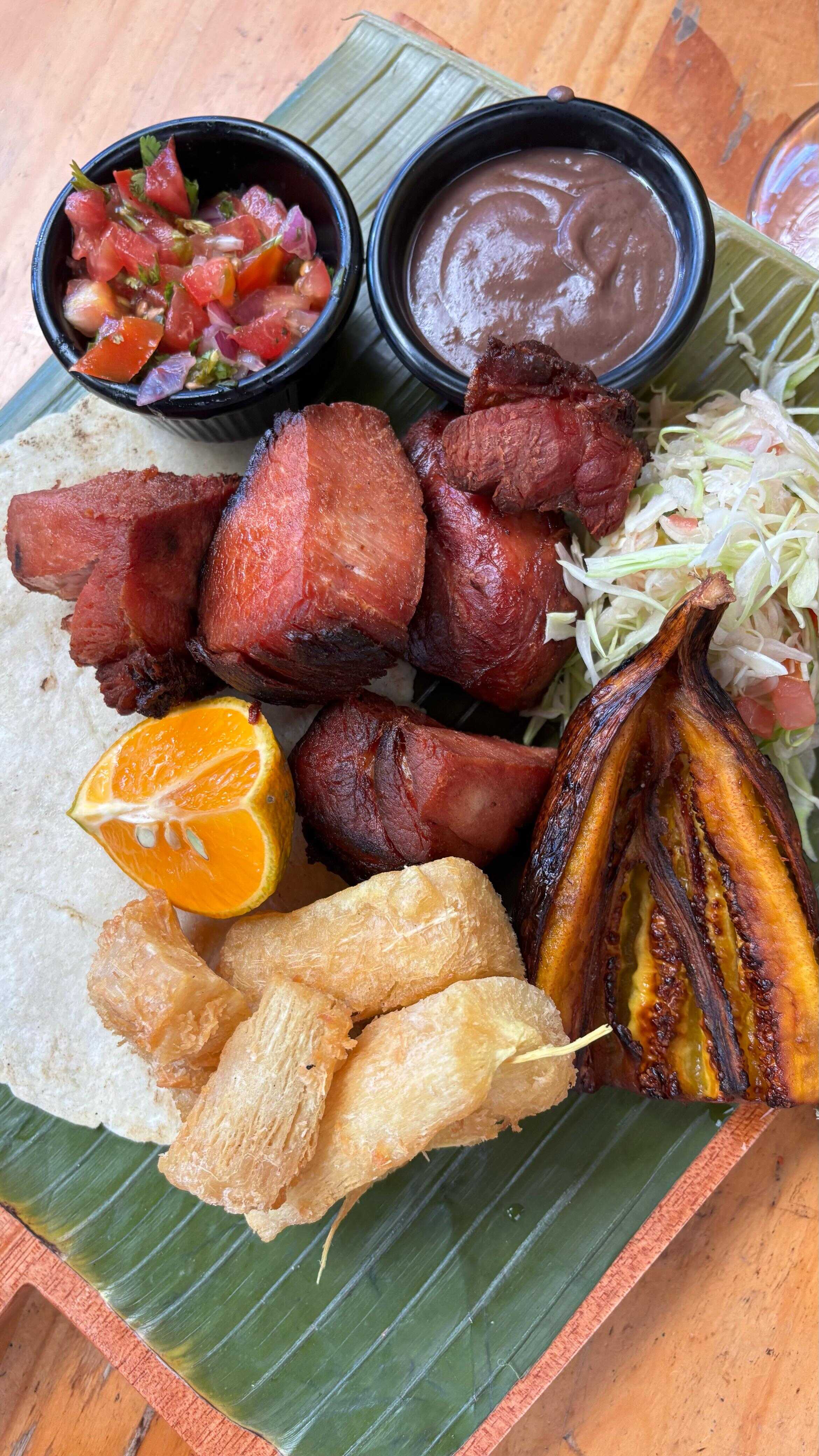 Chicharrones acompañados de tortillas, pico de Gallo,frijoles molidos , yuca frita, ensalada de la casa.