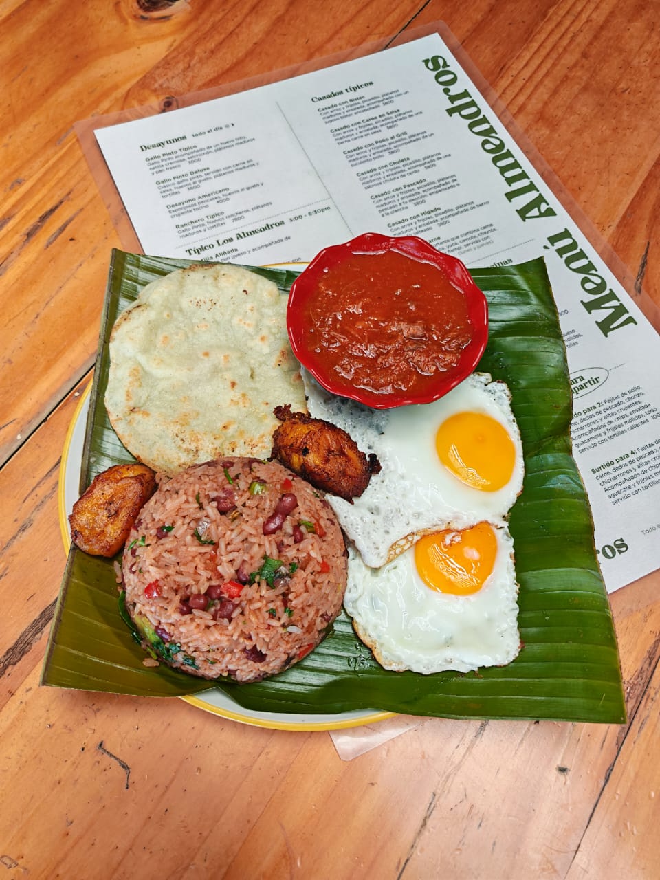 Gallo pinto acompañado con huevos rancheros, plátano maduro y tortilla