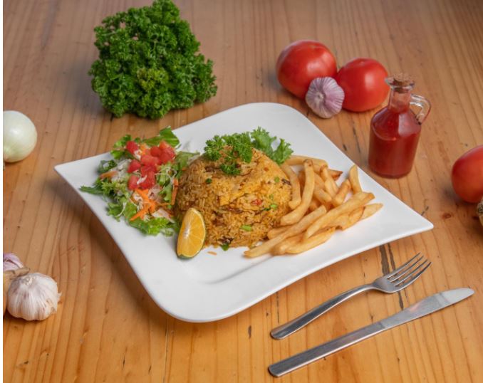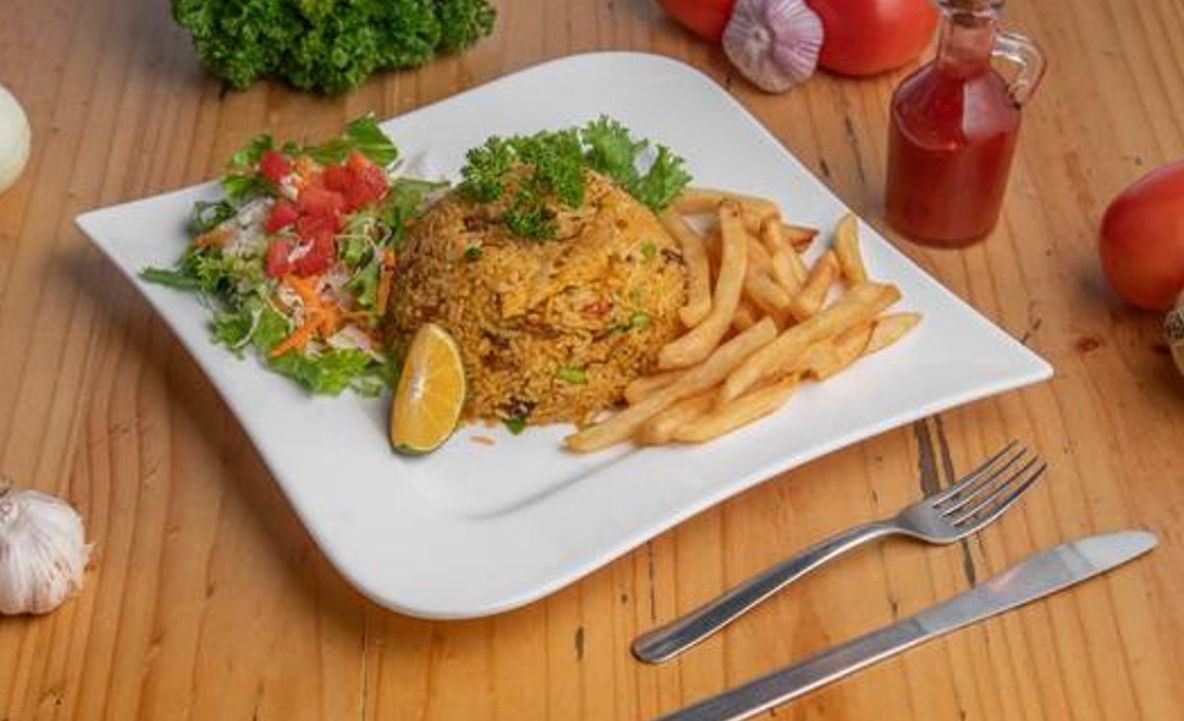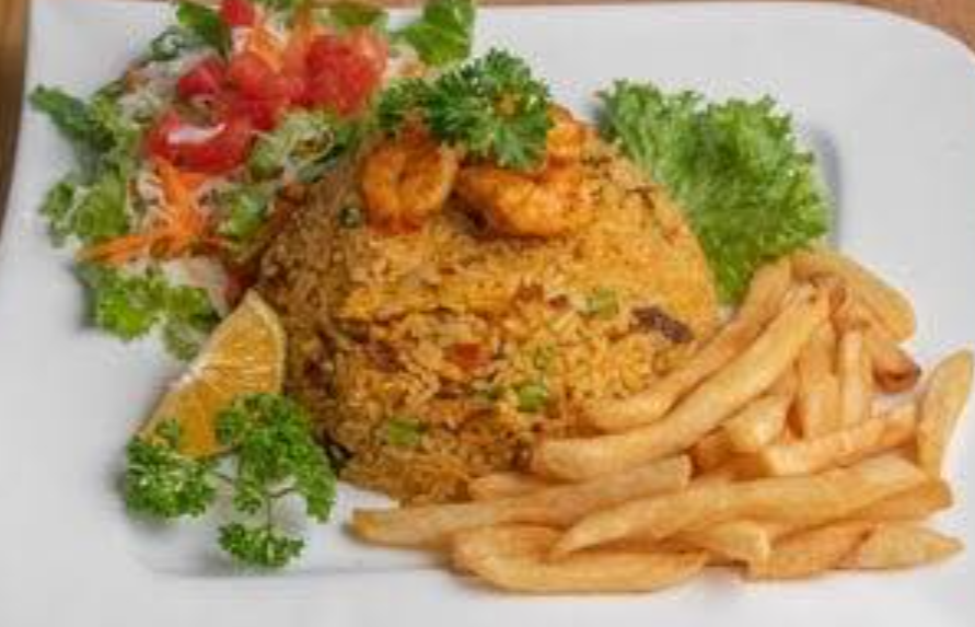 Arroz arreglado con carne, pollo, camaron, papás a la francesa y ensalada verde.