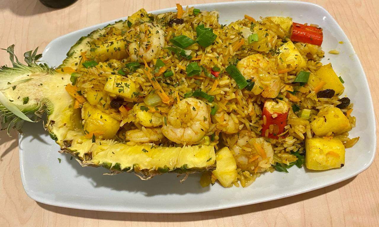 Arroz frito con camarones, surimi, pasas y piña.