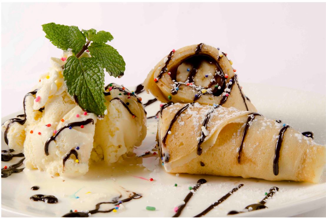 Banano envuelto en crepa con helado de vainilla con topping de chocolate.
