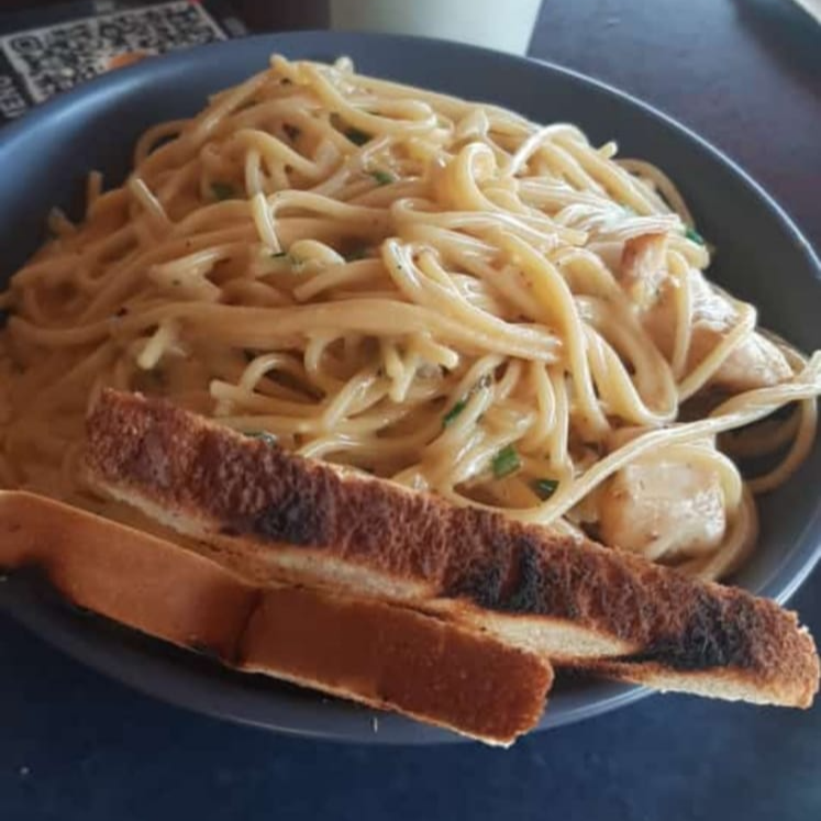 En salsa alfredo acompañado con pan de ajo.