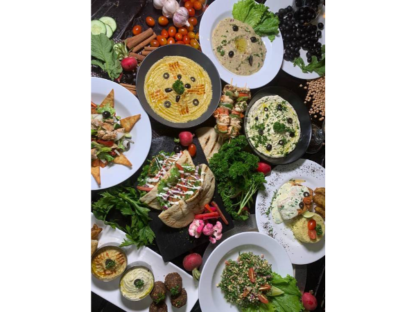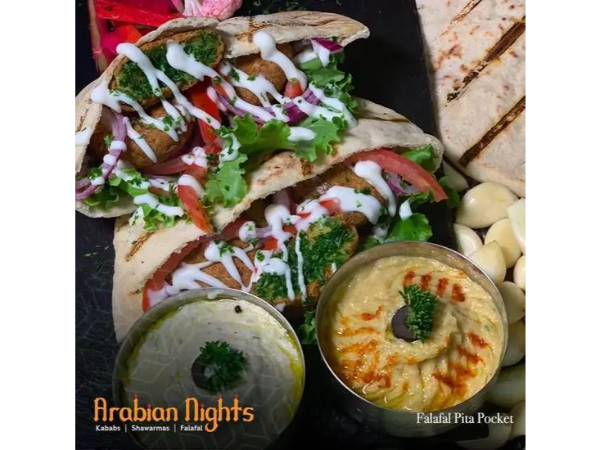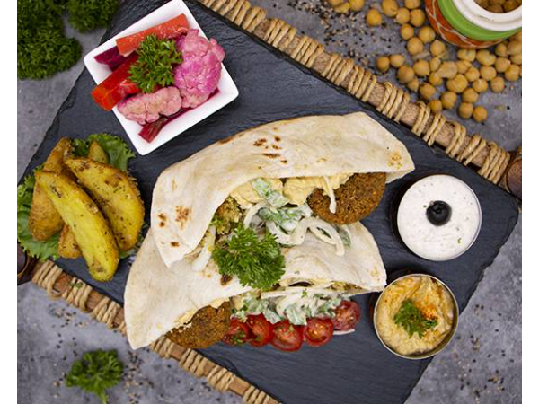 Incluye: bebida tamer hinda, postre baklawa. falafal clásico (bolitas de mezcla triturada de garbanzos hidratados en agua con cebolla, ajo, perejil y diferentes hierbas y especias), dip de tahini con hummus, tamer hindi (jugo de tamarindo y menta con agua de rosa) más postre baklawa.