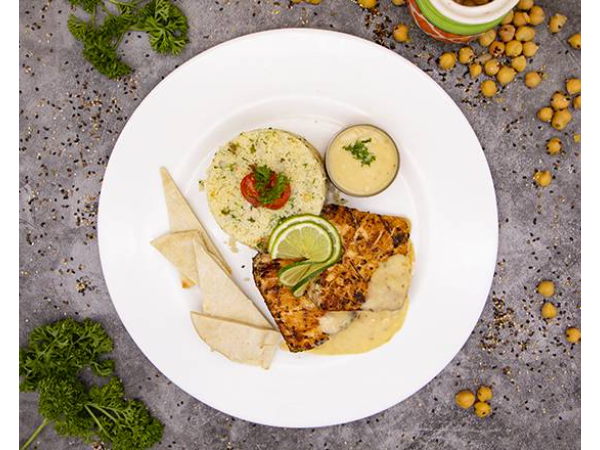 Zataar Salmón Asado, CousCous, Papas más Ensalada