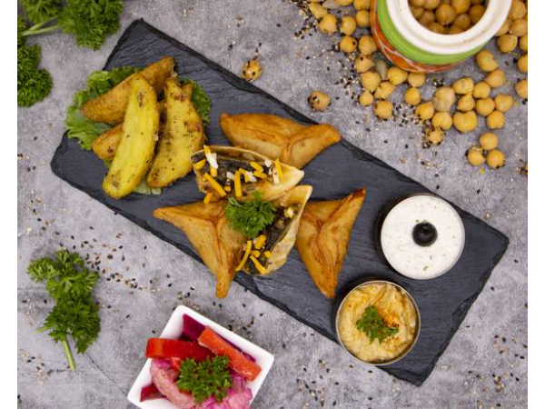 Pasteles, tipo estrella rellena con espinaca, ajo, pimienta, perejil y queso cheddar, que se sirve como aperitivo o merienda (4 piezas), servido con dos dips: hummus y yogur ajo. Incluye pan pita.