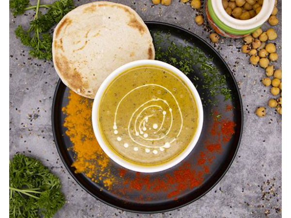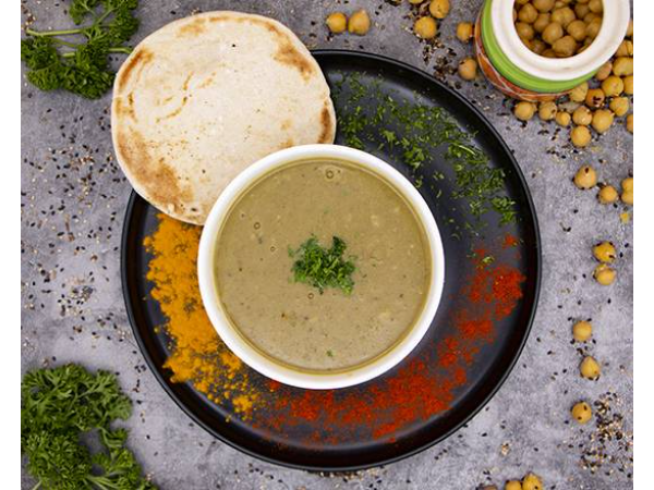 Crema de lentejas árabe con hierbas especiales. Servido con pan pita casera.