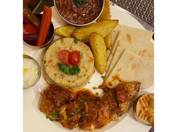 Pollo asado con perejil, aceite de oliva, ajo servido de nuestra salsa clásica, CousCous, pan pita casera, papas de ajo, limón, 2 dips de hummus y lebne.