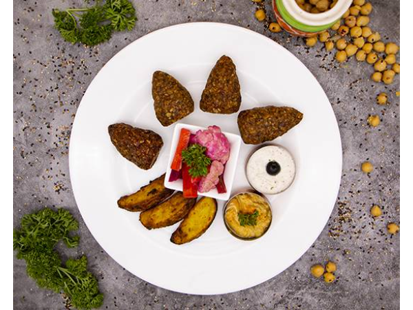 Croquetas con forma de fútbol, rellenas con carne picada, trigo molido bulgur, cebolla, canela, nuez moscada, pimienta de Jamaica y clavo. 4 piezas, servido con dos dips: hummus y yogur ajo. Incluye pan pita.