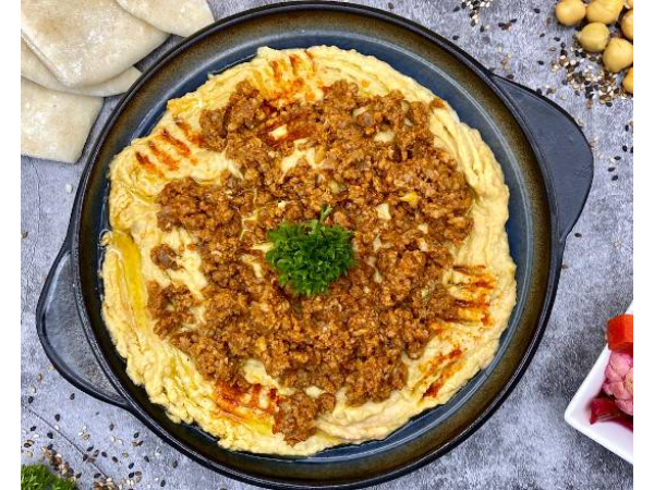 Puré de garbanzos con carne de cordero, res y pollo, tahine de ajonjolí blanco, ajo, aceite de oliva, limón y un poco de pimentón por encima para la decoración, servido con pan pita casera.