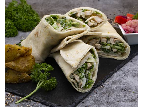 2 Rollos grandes de pollo asado con hierba libanesa, lechuga, cebolla, tahine, hummus, labne, perejil en pan pita casera, servido con nuestra especial ensalada conserva de vegetales, papa de ajo y limón. Incluye 2 dips: hummus y lebne.