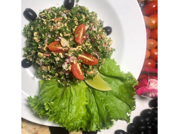 Ensalada vegetariana levantina de perejil finamente picado, tomates, menta, cebolla, bulgur y sazonada con aceite de oliva, jugo de limón. Servido con pan pita casera.