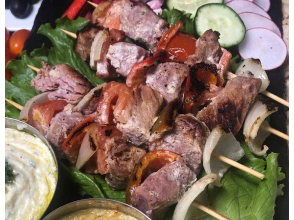 Jugosos trozos de res asado con chile dulce, cebolla, tomate, marinado en tahine, ajo, aceite de oliva; servido con papas de sabor ajo y limón.