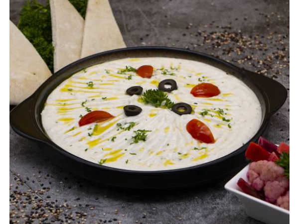 2 Dips: hummus y lebne. Bolitas de mezcla triturada de garbanzos hidratados en agua con cebolla, ajo, perejil y diferentes hierbas y especias. Servido con pan pita casera y salsa de yogur (5 piezas).