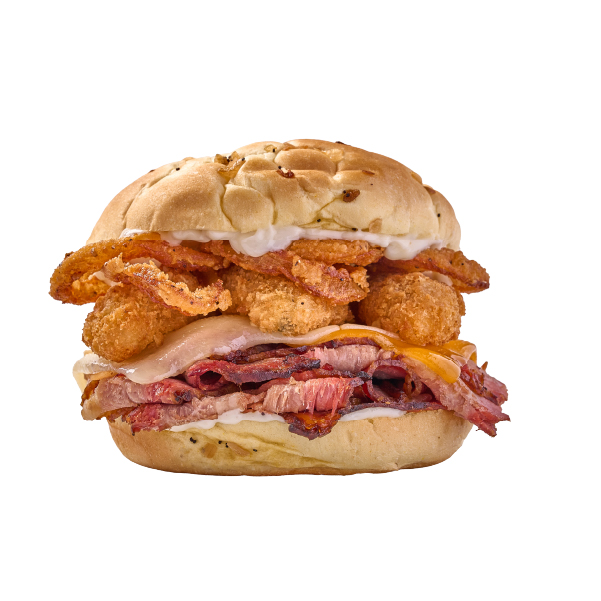 Brisket jugoso en pan de cebolla, con queso suizo y cheddar derretidos, Jalapeño Poppers crujientes y un toque cremoso de mayonesa.
