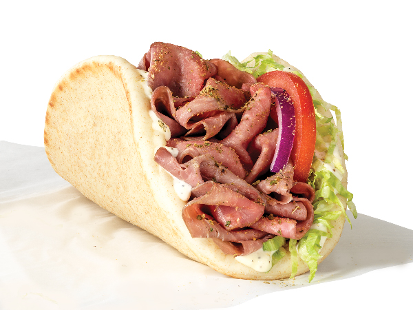 nuestro clásico Roast Beef en rodajas finas colocadas sobre un pan plano caliente con lechuga, tomate, cebollas rojas, salsa Gyro y condimento Griego.