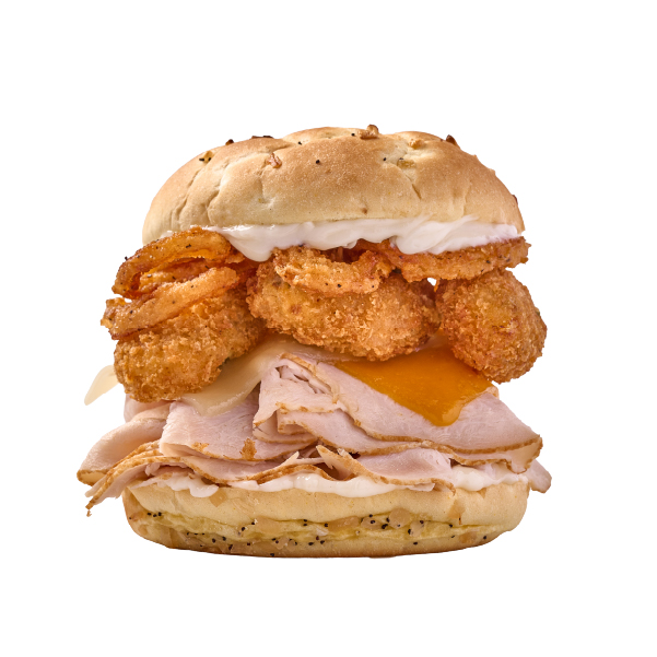 Jugoso pavo servido en pan de cebolla, acompañado de queso suizo y cheddar derretidos, crujientes jalapeño poppers rellenos de queso y crispy onions con cremosa mayonesa.