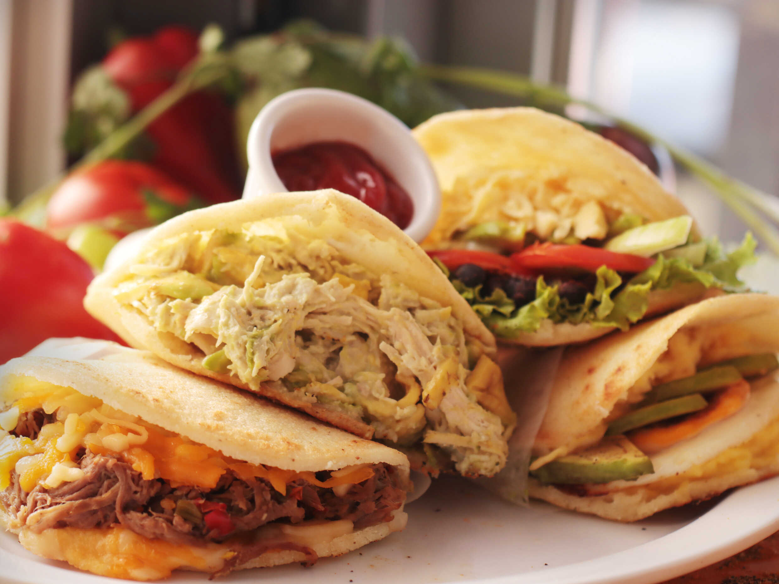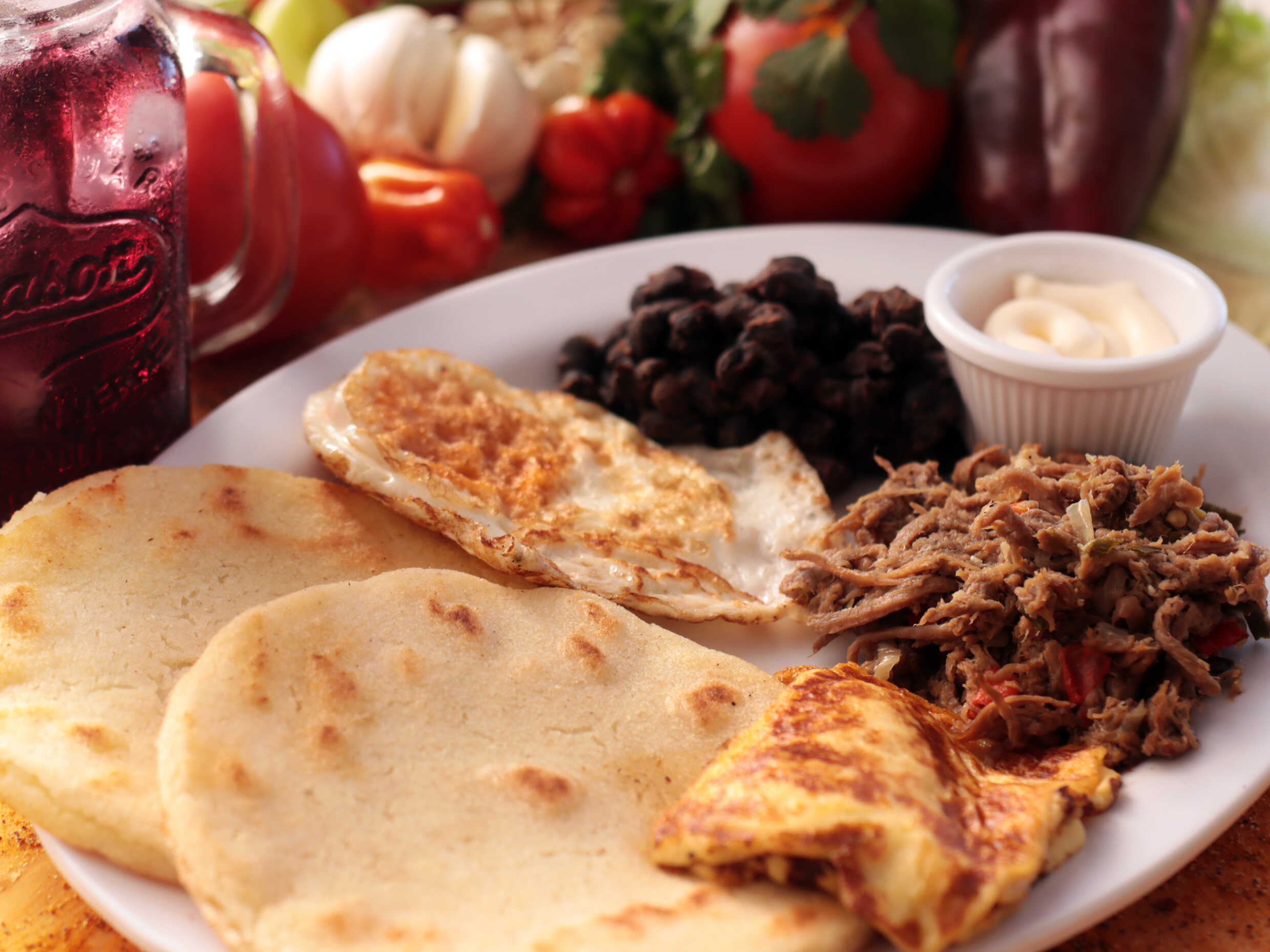 Elegí carne o pollo, queso blanco o amarillo y tres ingredientes (lechuga, aguacate, tomate, cebolla, frijoles y plátano maduro).