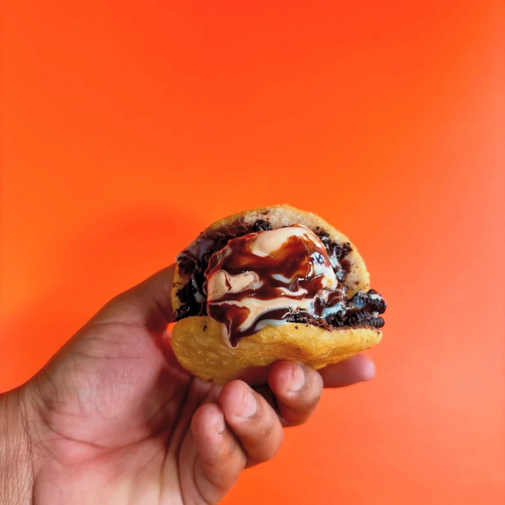 Rellena de galleta Oreo, Nutella, leche condensada, chocolate Hershey y helado de naranja holandesa.