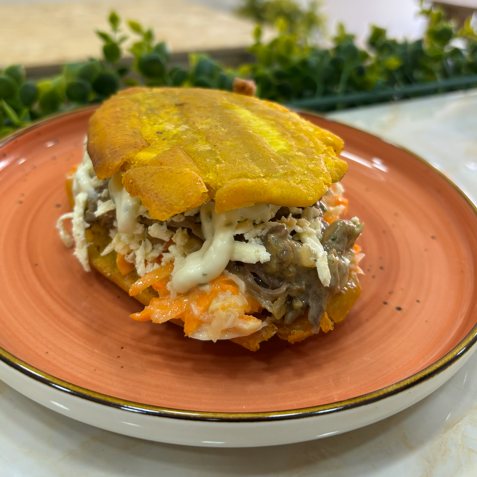 Hamburguesa de patacón rellena de carne mechada, frijoles, queso, pico de gallo y ensalada.