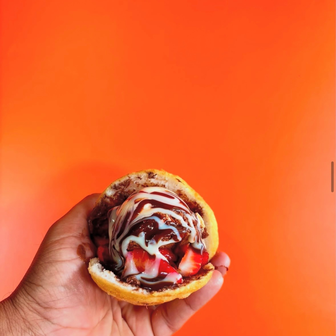 Rellena de fresas, Nutella, leche condensada, chocolate Hershey y helado de naranja holandesa.